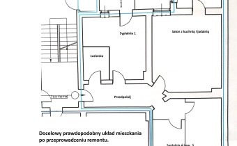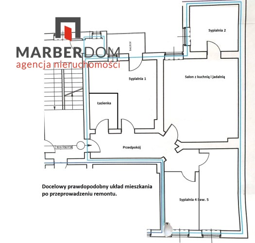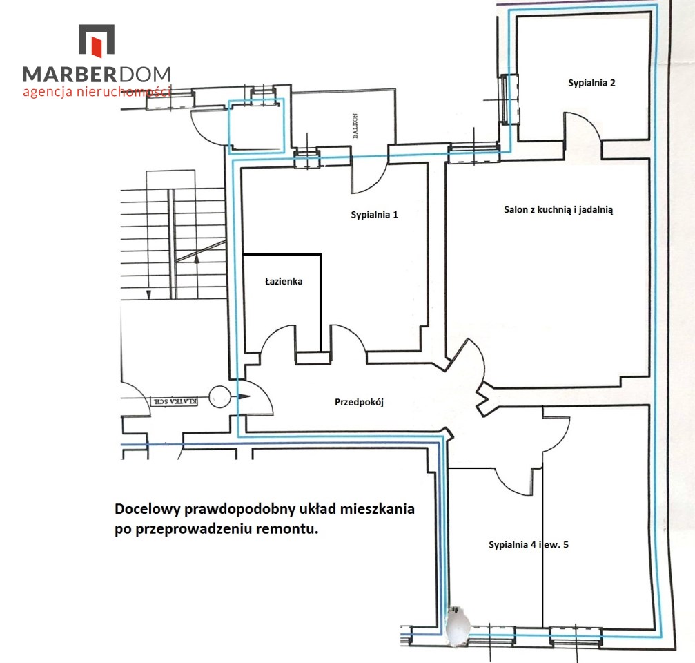 Po przeprowadzeniu generalnego remontu można zmienić układ mieszkania i prawdopodobnie docelowo uzyskać 4-5 pokoi (w tym salon z kuchnią, jadalnią; 3-4 sypialni).
