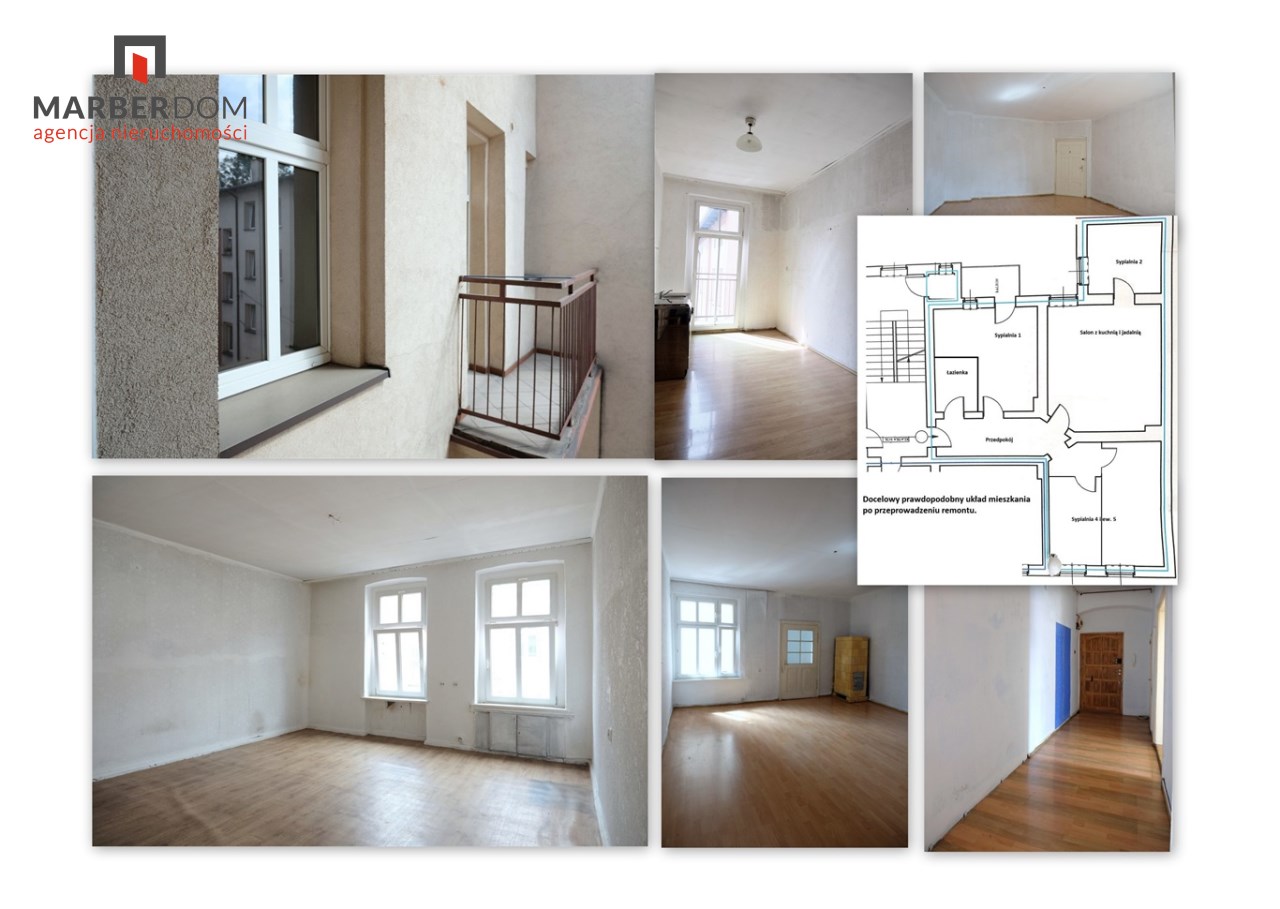 Pomieszczenia: 3 pokoje (2 duże, jeden mały), duża kuchnia, łazienka z wc, przedpokój, balkon.