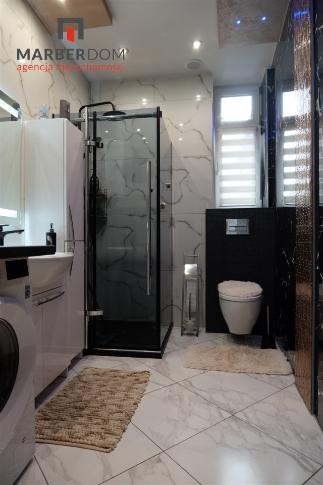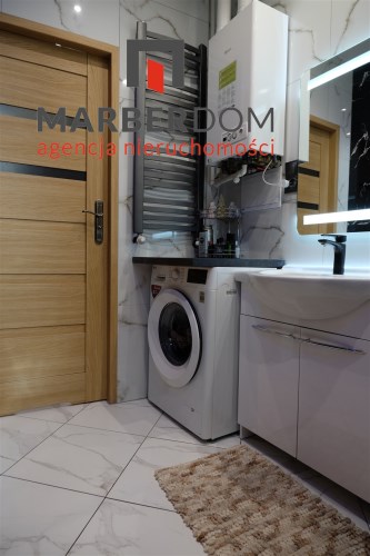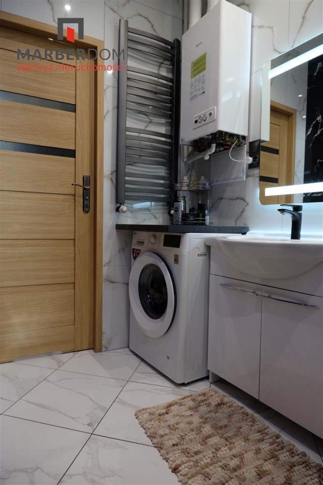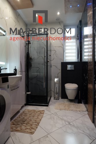 - łazienka: kabina prysznicowa z deszczownicą, umywalka z szafką i podświetlanym lustrem, pralka;