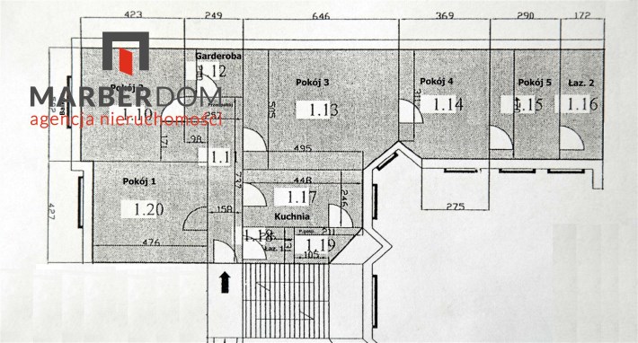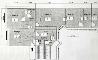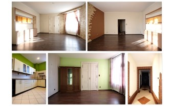 Pomieszczenia: 5 pokoi (2 duże niezależne, 1 duży przechodni, 2 mniejsze przechodnie), 2 łazienki, kuchnia, garderoba, przedpokój, pom. gosp., balkon.