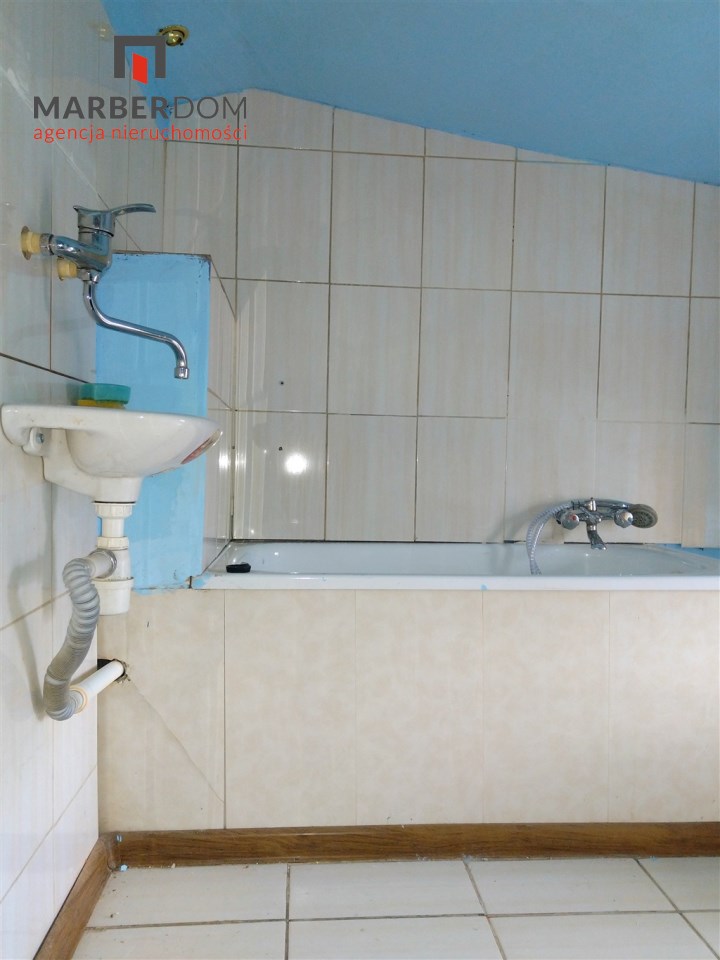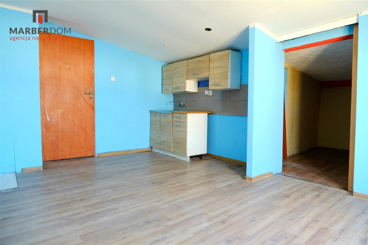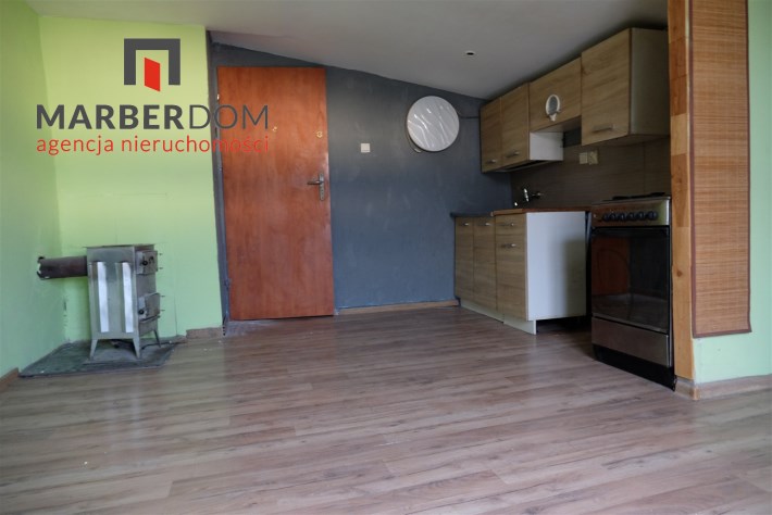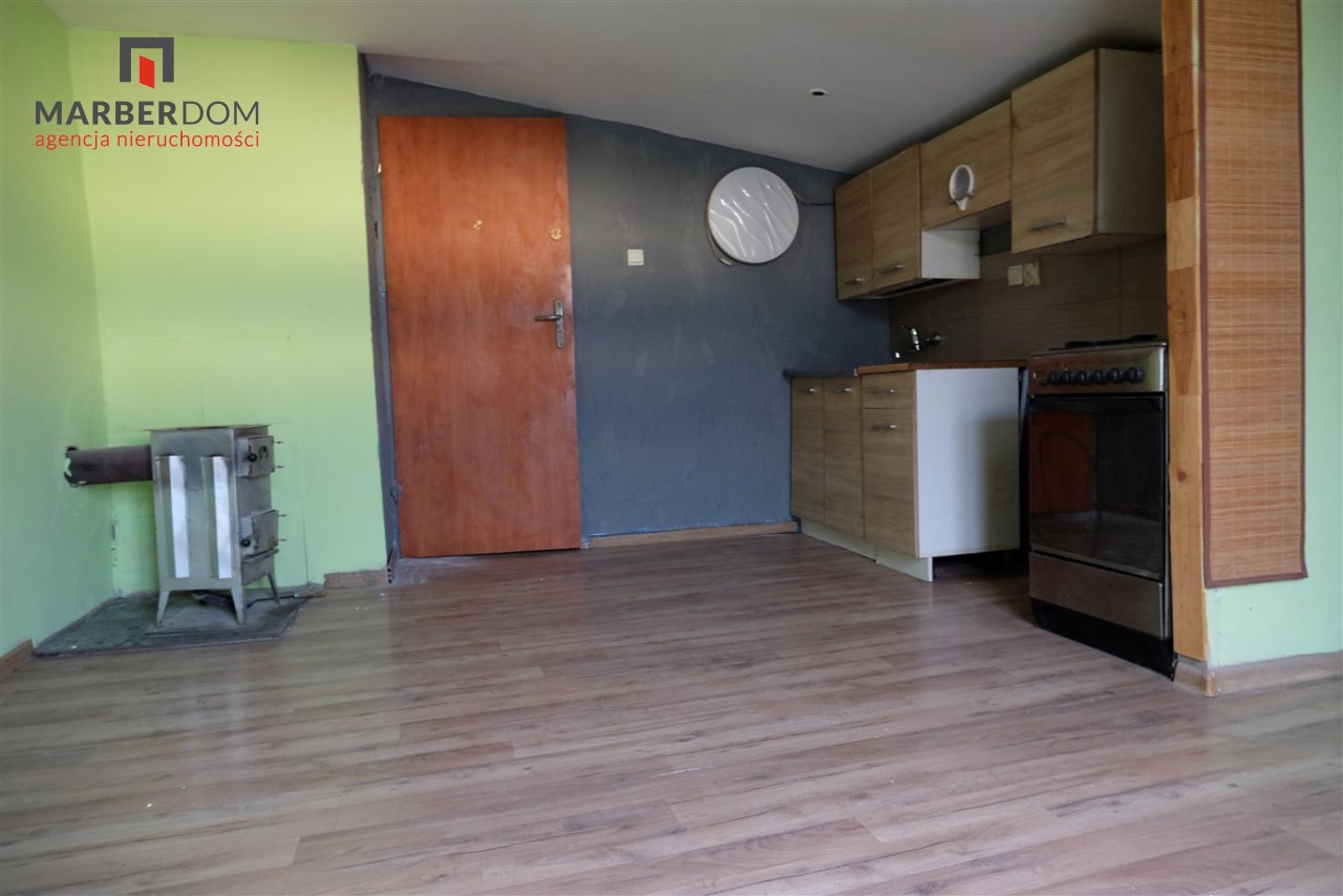 Pomieszczenia: pokój z kuchnią, łazienka (niska, skosy), przedpokój.
