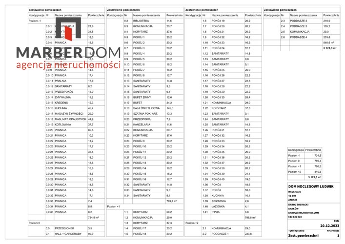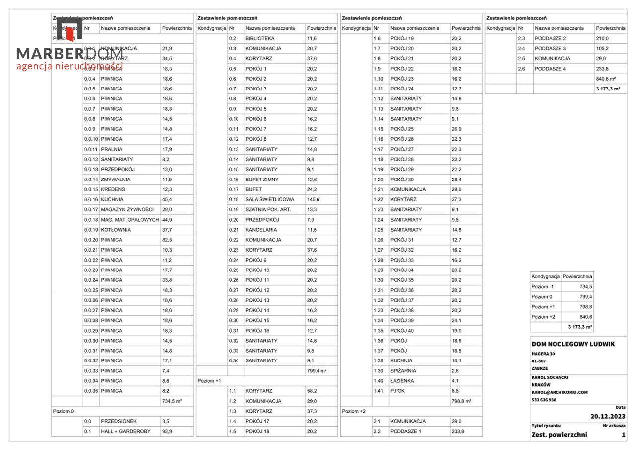 Powierzchnia użytkowa zinwentaryzowana to 3 173,3 m² lecz posługiwaliśmy się pierwotnym projektem, a w późniejszym czasie zostało dobudowane skrzydło o powierzchni około 100 m²